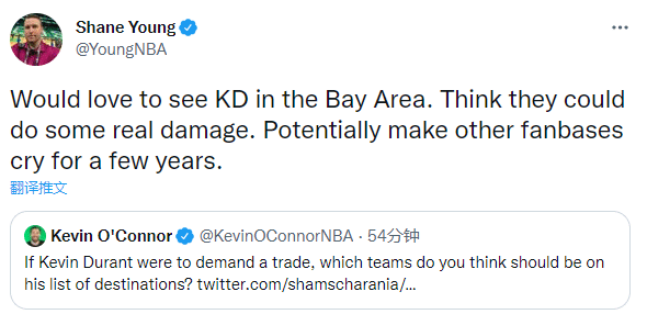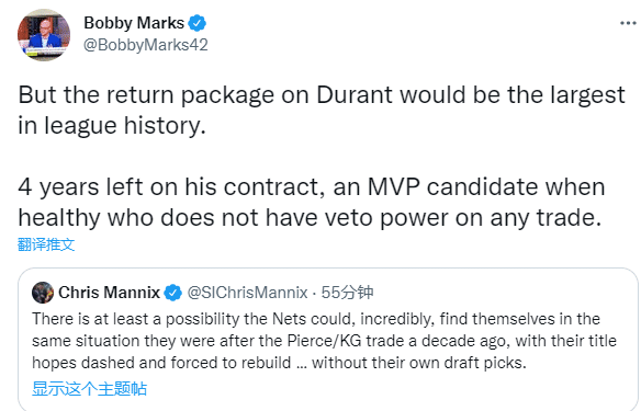 对于杜兰特可能离开篮网,Kevin Ocnonor表示若杜兰特申请离队,哪些球队会是他的下家?NBA记者Shane Young发推表示:很想看到杜兰特重返勇士,我想他们会造成真正的伤害,可能会让其他球队的球迷哭上好几年。Bobby Marks:杜兰特换来的回报将是联盟历史上最大的—— 他的合同还剩 4 年,健康时的MVP候选人。