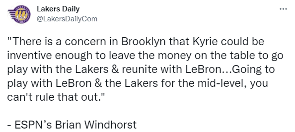 对于欧文可能与詹姆斯重聚,ESPN记者Brian Windhorst表示:布鲁克林篮网有人担心欧文愿意放弃薪水并且前往湖人与詹姆斯重聚,你不能排除他将和詹姆斯在湖人联手的可能性。