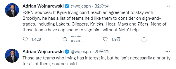 此前欧文和篮网的续约谈判陷入僵局,shams曾报道若欧文离开篮网,湖人、快船、尼克斯等队有意他;如今沃纳罗斯基曝光欧文心仪的下家,湖人、快船、76人、尼克斯、热火和独行侠在列;欧文有意加盟湖人,此前Marc Stein曾透露欧文已经和詹姆斯商讨过在湖人重聚的可能性。