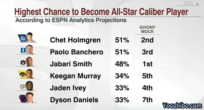 EPSN预测本届新秀未来入选全明星概率前六位排名,具体情况时霍姆格伦和班凯罗都有51%的概率入选全明星,贾巴里-史密斯入选全明星的概率是48%,基根-穆雷34% 、杰登-艾维和戴森-丹尼尔都是33%。