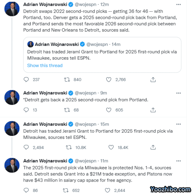 活塞和开拓者达成交易。活塞将格兰特送往开拓者,得到一个首轮签和多个次轮签。消息人士透露,这个来自雄鹿的2025年首轮签是前4顺位保护。活塞获得了2100万美元的交易特例,现在腾出了4300万美元的薪金空间。活塞还把今年的46号签与开拓者对换,换回今年的36号签。开拓者还将把2025年的次轮签,以及2026年的开拓者和鹈鹕更好的一个次轮签送给活塞。