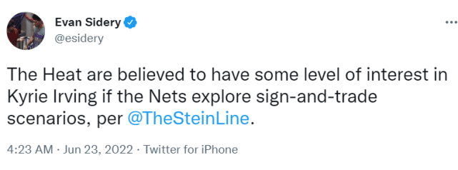 同样来自斯坦恩的报道,如果篮网探索先签后换送走欧文的方案,热火对欧文有一定的兴趣。此前,欧文就传出过和热火的交易流言,目前热火把巴特勒和阿德巴约列为非卖品,除了他们俩,队内的其他球员都可以被放进交易谈判中。