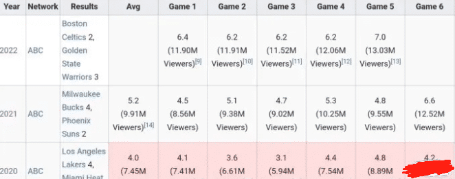 不过数据才是最好的证明,在总决赛打完之后,帕金斯好像被打脸了,近期,美国媒体列举出21-22赛季和19-20赛季湖人夺冠赛季的收视率,在湖人队对阵热火的总决赛中,收视率最高4.8,最低只有3.1,而今年勇士队对阵凯尔特人的收视率是7,最低也有6.2,这也意味着着帕金斯被打脸,还是有人想看库里的,库里这一次的总决赛收视率超过詹姆斯,帕金斯也被妥妥的打脸了。