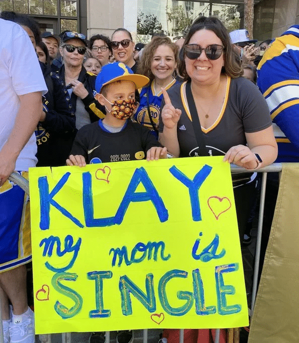 为什么呢?库里、格林这些球星虽然受欢迎,但是毕竟已经结婚,对于女球迷没有太多的吸引力,而作为单身钻石王老五的汤普森却受到了很多女球迷的欢迎,比如一个小男孩就举着牌子,牌子上面写着:克莱,我妈妈是单身。