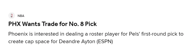 据选秀专家Jonathan Givony报道,太阳被认为是可能和鹈鹕就此进行交易的球队之一。