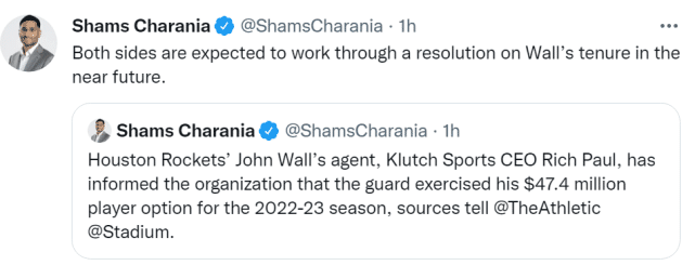 名记Shams报道,消息人士透露,火箭后卫沃尔的经纪人里奇-保罗已告知球队,他的客户将执行下赛季4740万美元的球员选项。2021-22赛季,沃尔和火箭达成了不出战协议,整个赛季没有上场。31岁的沃尔是2010年的状元秀,生涯至今,他出场613场常规赛,场均19.1分4.3篮板9.1助攻,5次入选全明星。此前火箭曾和包括湖人在内的多队讨论过沃尔的交易,但都未能达成。双方预计会很快再商讨沃尔的未来。