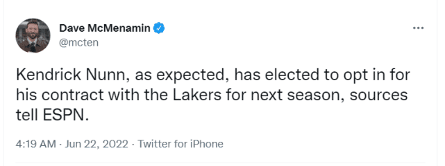 名记McMenamin报道,湖人后卫纳恩已经执行525万美元的球员选项。他在2021年8月和湖人签下两年合同。2021-22赛季,纳恩因骨挫伤缺席了整个赛季。生涯至今,26岁的纳恩出战123场常规比赛,场均15分2.9篮板3助攻。