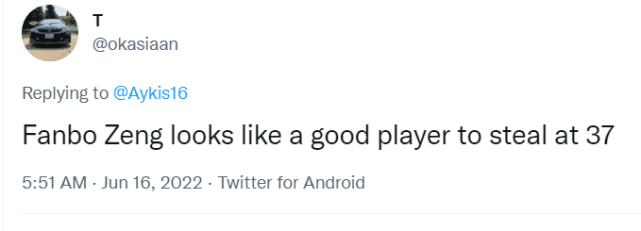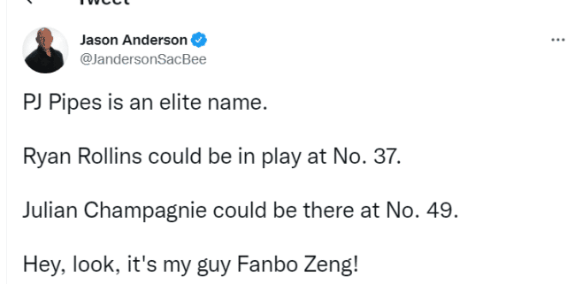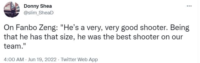 在社媒上,已经有不少球迷支招的自己主队在次轮选择曾凡博。G联赛点燃队的主教练在近日采访中也谈到曾凡博。“他是一个非常非常好的投手,以那样的身高条件来说,他就是我们队里最好的投手了。”