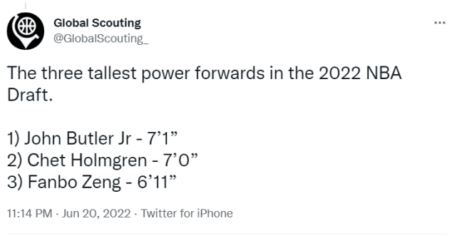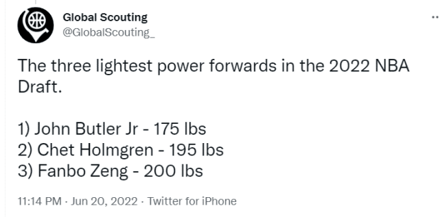 美媒也公布了选秀大会的身高体重数据排名,曾凡博在大前锋中的身高排名第三,体重是大前锋里第三轻的。有趣的是身高体重前两位的大前锋也都一样。身高最高的大前锋约翰-巴特勒(2米16),也是体重最轻的大前锋(79公斤)。状元热门之一的大前锋霍姆格伦是身高第二高的大前锋(2米13),体重(88公斤)是大前锋里第二轻的。榜单第三位就是曾凡博,身高2米11,体重91公斤。