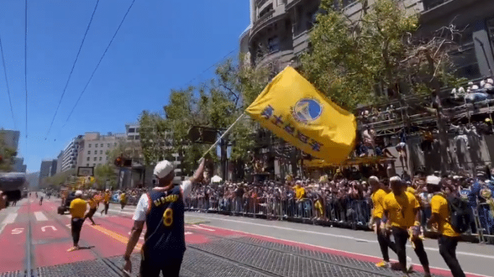 现场还有神秘大旗亮相,上面写的是中文“勇士总冠军”,值得一提的是这一面大旗此前出现在很多的场合中,包括季后赛和总决赛的大通中心球馆外面,都可以看到这面大旗。现在随着勇士夺冠,这面旗帜也带来了好运,勇士夺冠游行期间,这面中文“勇士总冠军”的大旗也被挥舞了起来。