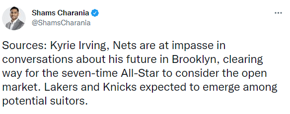 据名记shams报道,欧文与篮网的续约谈判陷入僵局,他可能试水自由市场,并且可能离开篮网;若欧文决定离队,湖人、快船和尼克斯三支球队有意引援他。
