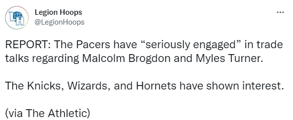 12、步行者认真谈论以布罗格登和特纳为主体的交易,奇才、尼克斯和黄蜂有意参与交易;这意味着联盟正在酝酿大交易。