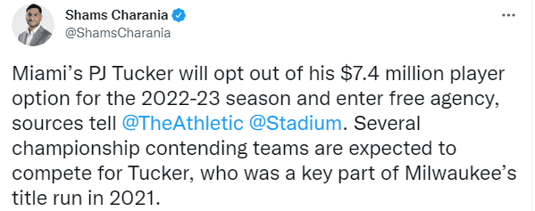 6、据Shams报道,PJ-塔克将不会执行下赛季价值740万美元的球员选项,他将进入自由球员市场;预计有几支争冠球队将会争夺塔克,他是雄鹿2021年夺冠的关键球员。