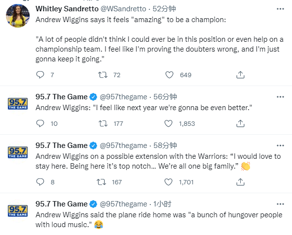 维金斯还透露在勇士返程机舱内,有一群宿醉未醒的人还有嘈杂的音乐;对于阿特金森留队,维金斯表示:他放弃了主教练的工作,并回来继续成为我们团队的一部分,这简直太棒了。这表明在我们的团队里是一群想要赢球的人,我们都在同一个页面上,我们期待着未来。
