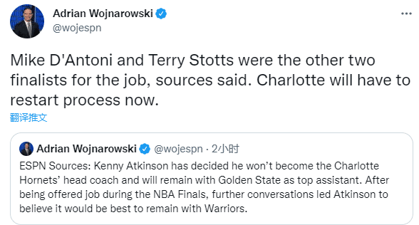 据名记沃纳罗斯基报道,阿特金森决定不担任黄蜂主帅,继续担任勇士首席助教,在NBA总决赛期间获得黄蜂主帅职位后,进一步的谈话让阿特金森相信他最好还是留在勇士队。