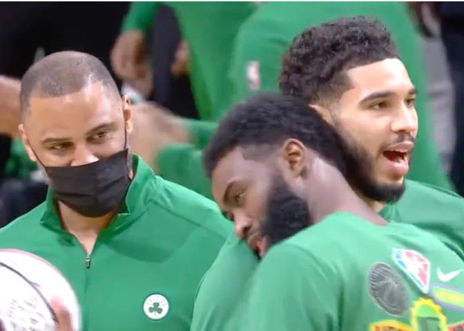 在输掉比赛后,塔图姆坐在板凳上深思,杰伦布朗走了过去,他送给了塔图姆一个拥抱,并且对着塔图姆耳语了一番,塔图姆的脸上也露出了微笑,这一刻,塔图姆熄灭的斗志再一次燃起。