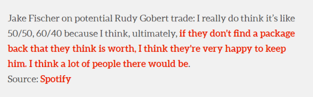 老鹰和公牛是对戈贝尔最感兴趣的两支球队,不过他们未必能带走这位3届最佳防守球员。据B/R记者Jake Fischer报道,如果爵士不能得到他们满意的回报,球队会非常高兴留下戈贝尔,而那里的很多人抱有这种想法。“我真的认为戈贝尔离队的可能性是50对50,或者60对40。”