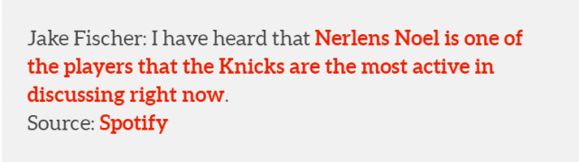 2021-22赛季,尼克斯37胜45负,无缘季后赛。他们预计在休赛期对阵容进行一些调整。Jake Fischer报道称,诺埃尔是尼克斯目前最积极兜售的球员。诺埃尔的合同还剩两年,2022-23赛季是924万美元,2023-24赛季是968万美元(球队选项)。28岁的诺埃尔本赛季只打了25场比赛,场均3.4分5.6篮板1.2抢断1.2盖帽。