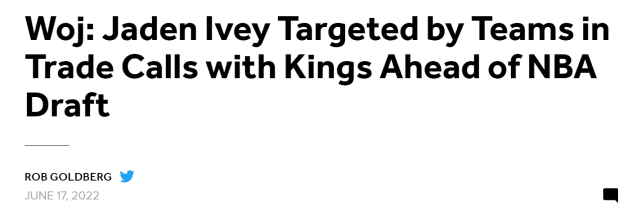 据名记沃纳罗斯基报道,多支球队寻求向上交易得到国王的4号签,而他们的目标就是今年的新人后卫杰登-艾维。艾维的预测顺位就是第4位,预计在贾巴里-史密斯、霍姆格伦和班切罗之后被选中。沃纳罗斯基表示,活塞、步行者、尼克斯和奇才都有兴趣。