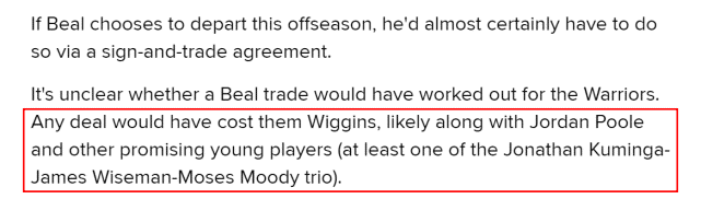 Lowe表示,比尔如果今年休赛期离开奇才,几乎肯定要通过先签后换的方式交易。他的合同还剩下一年(3726万球员选项)。勇士要想换来比尔,除了维金斯,可能还要搭上普尔和其他年轻球员(至少是库明加、怀斯曼和穆迪中的一人)。