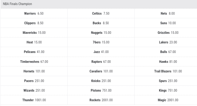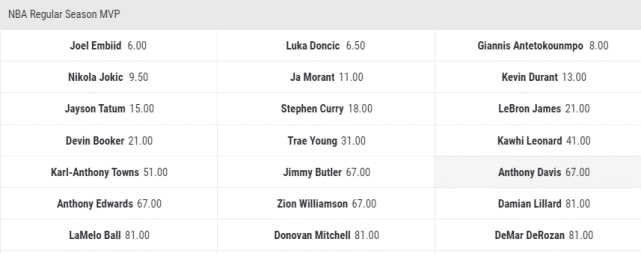 1.恩比德(6.00)、2.东契奇(6.50)、3.字母哥(8.00)、4.约基奇(9.50)、5.莫兰特(11.00)、6.杜兰特(13.00)、7.塔图姆(15.00)、8.库里(18.00)、9.詹姆斯(21.00)、9.布克(21.00)。