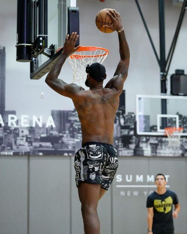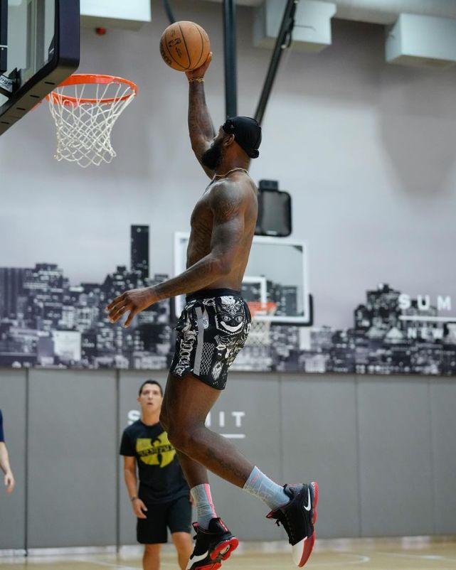 詹姆斯赤膊上阵,穿着一条黑白花色运动球裤,扎着黑色的头巾。他在训练中状态出色,连中三分,还秀飞身暴扣。奔向38岁的詹姆斯,依然宝刀不老。2021-22赛季,他场均得分突破30分,而2022-23赛季,他预计将超越贾巴尔,成为历史得分王!