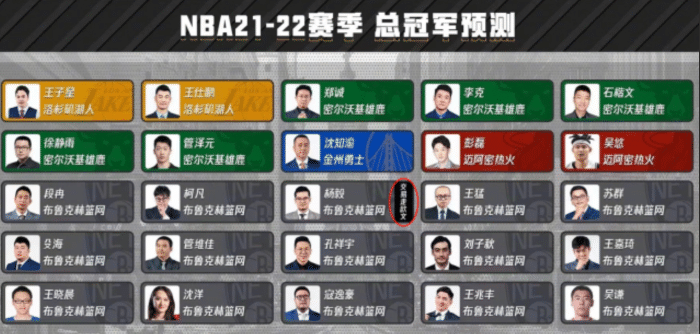 从预测的情况来看 ,25人中有多达15人预测篮网夺冠,5人预测雄鹿夺冠,2人热火2人湖人。仅仅只有沈知瑜指导,预测勇士夺冠。赛季开始前,篮网坐拥杜兰特、哈登、欧文,显然是头号大热。雄鹿贵为卫冕冠军,实力也非常雄厚。热火引进了塔克、洛瑞等冠军老将,湖人则引进了威少。但最终,勇士拿到总冠军,而沈知瑜也一战封神。