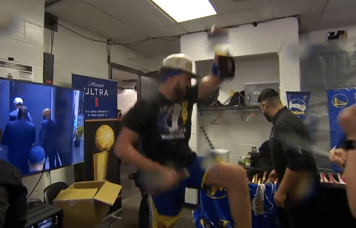 勇士更衣室庆祝曝光!狂泼香槟+法克格林 全队合影库里克莱C位抱奖杯