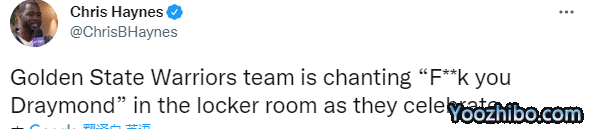 勇士更衣室疯狂庆祝曝光,疯狂泼洒香槟,汤普森尽享香槟雨疯狂跳舞,连护目镜也不戴了;据名记报道,勇士全队在更衣室“FxxK YOUDraymond”,法克格林庆祝。