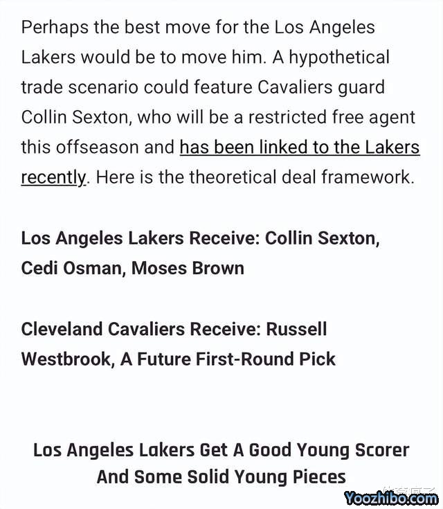 具体的交易方案为骑士队送出科林-塞克斯顿、切迪-奥斯曼、摩西-布朗,湖人则是送出拉塞尔-威斯布鲁克和一个未来的首轮签。威少现在就是这样的一种处境,他拿着4700万的合同,但是个人能力也就是合同的一半而已,这样的溢价薪水使得湖人很难将他送走,如果想要送走威少,至少要添上一个首轮签,这已经成为了各支球队的共识,湖人这个冤大头当肯定是当定了,谁让他们花那么大价钱交易威少呢。