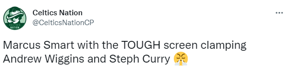 下半场,凯尔特人疯狂反扑,在一次进攻中,斯玛特为塔图姆挡拆,一只手拽住维金斯,另一只手夹住库里的手臂;斯玛特用这样的方式挡住维金斯和库里,塔图姆投进空位三分,对此库里有些不满,冲着场边的裁判,示意自己的手臂被斯玛特夹住了,被裁判无视。