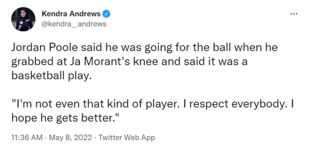 普尔本人在赛后接受采访,他表示自己已经看过回放,但并不认为自己的动作有问题。他认为自己抓到莫兰特的膝盖时,其实是冲着球去的,他说这是一个篮球动作。“我不是那种(肮脏的)球员,我尊重所有人,我希望他(膝盖)能好一些。”