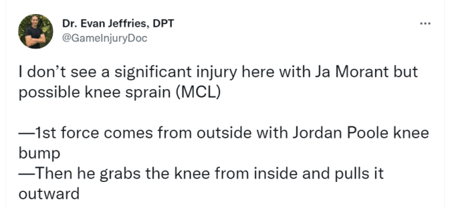目前,莫兰特还需要接受更多的检查,但医学专家们推测可能是膝盖内侧的副韧带扭伤。此前雄鹿的米德尔顿就受到类似伤病困扰,至今仍未复出。已经有美媒晒出“无莫熊”本赛季的表现,暗示接下来的系列赛可能要在没有莫兰特的情况下进行了!本赛季莫兰特缺阵25场比赛,灰熊20胜5负!