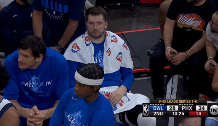 东契奇打满第一节,早已累的满头大汗,首节结束时,东契奇和克劳德发生口角,互喷垃圾话,之后东契奇向裁判投诉;独行侠首节28-32落后4分,第二节东契奇休息时,独行侠15-6攻势反超比分,这是他们系列赛首次领先太阳。