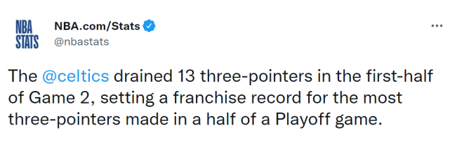 4.绿军上半场投中13个三分球,创季后赛队史半场三分新高。