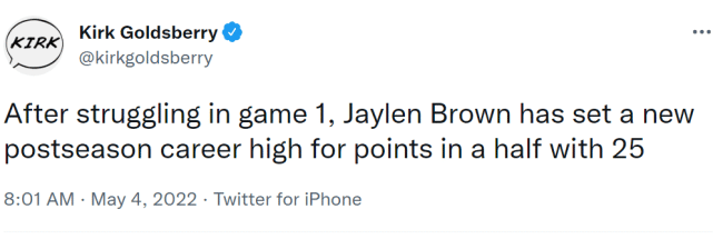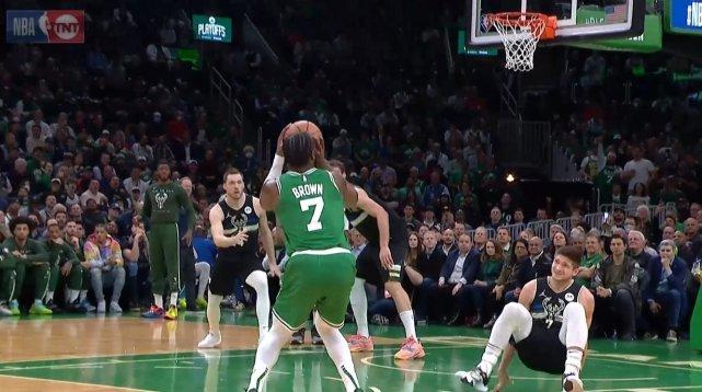 2. 杰伦-布朗上半场得到25分,创个人季后赛生涯半场得分新纪录。