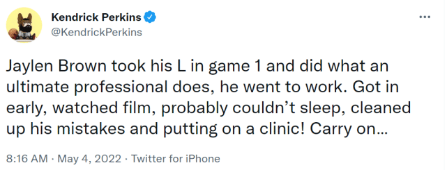 半场休息时,帕金斯点评了布朗的表现。“输掉第一场比赛后,布朗做了一个职业球员该做的事情,他回去后努力训练,早早抵达球馆,看录像,甚至有些废寝忘食,他在用这样的方式来修正自己犯下的错误,并解决问题。”
