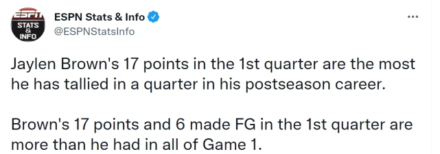 1. 杰伦-布朗单节得到17分,创个人季后赛生涯单节得分新纪录,还超过自己G1的全场得分(12分)。