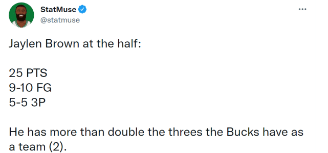 比赛首节,绿军就给雄鹿来了个下马威,打了一波18-3的开局,首节32-21领先对方,杰伦-布朗单节得到17分,晃倒阿伦一幕让他冲上热搜第一,詹姆斯也发推称赞他太可怕!字母哥7中1只得到2分。第二节,绿军火力更猛,五名球员至少单节5分,半场结束,绿军65-40领先25分。布朗上半场10投9中,三分5投5中,得到25分,字母哥12投2中,只得到5分。