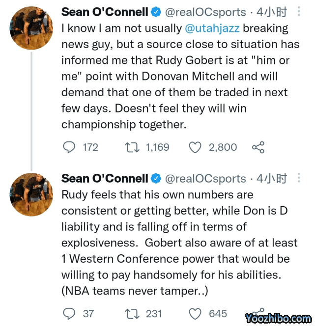 Sean O’Connell在社媒上写道:“我知道我通常不是爵士的爆料人,但一位接近状况的消息人士告诉我,鲁迪-戈贝尔与多诺万-米切尔已进入‘有他没我’的状态里,戈贝尔将在未来几天里要求球队交易他俩中的一个,他不觉得两人能在一起拿下总冠军。”