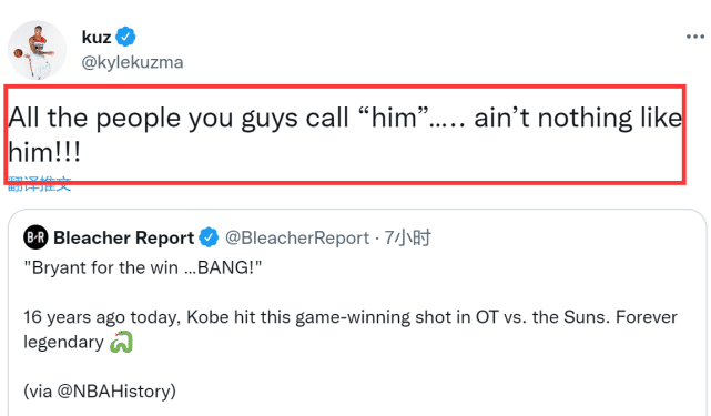 来源:24直播网05-02 15:2624直播网05月02日讯 16年前的今天,也就是2006年5月1日,湖人与太阳的季后赛首轮G4,科比常规时间最后时刻上篮实现绝平,紧接着在加时赛用一记压哨跳投绝杀对手。奇才球星库兹马今天在社媒上转发了科比双绝杀视频,并写道:那些所谓的“科比接班人”一点也不像。