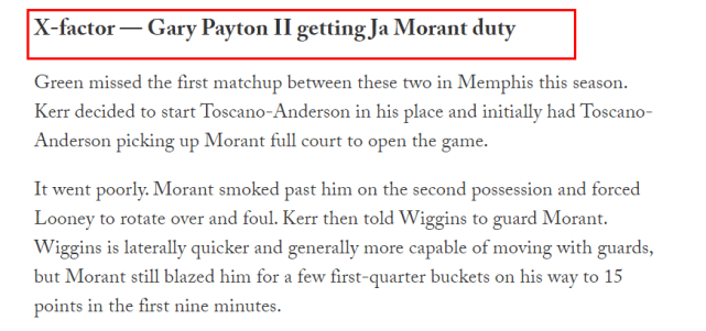 小佩顿的防守能力有多强?数据网站指出,常规赛的交锋中,小佩顿对位防守莫兰特和贝恩的20分钟里,两人累计出手17次,只命中了3球,三分球4中1,累计5次失误。进攻端,小佩顿打灰熊也有过高光表现,他的勇士生涯最高分22分,就是在本赛季对灰熊的一场比赛中拿到的。那场球,小佩顿不但得到22分,而且命中了4记三分。他确实有望在这轮系列赛里扮演一个非常重要的角色。