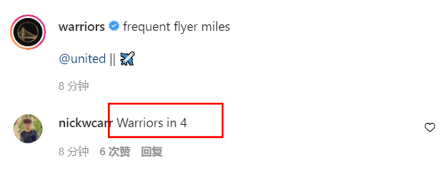 犹抱琵琶半遮面,看出这位拿爆米花挡住半边脸的兄弟是谁了吗?他就是赛季报销的怀斯曼。虽然不能上场比赛,但给队友加加油还是没问题的。很快有球迷在留言区给勇士球员们打气,一个署名nickwcarr的球迷写道:“勇士4-0!”NBA官网可没那么乐观,此前预测这轮系列赛是4-3,勇士艰难胜出。G1,勇士伊戈达拉和怀斯曼缺阵,灰熊蒂利、阿尔达玛、亚当斯缺阵。