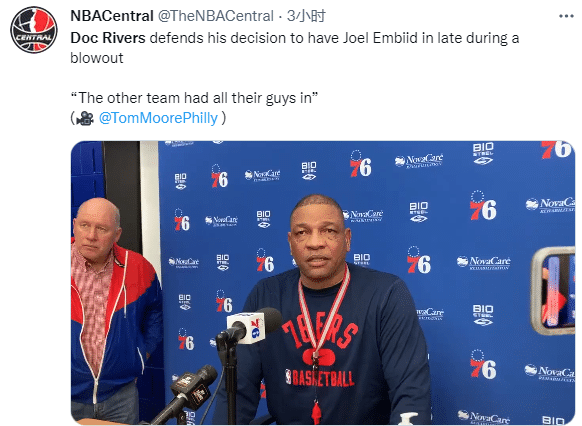 对于76人大比分领先猛龙却不换下恩比德,里弗斯表示:那时候对手的主力也都在场上,我本准备在他受伤事件发生的下一个回合叫暂停调整阵容,但事情就是这样。