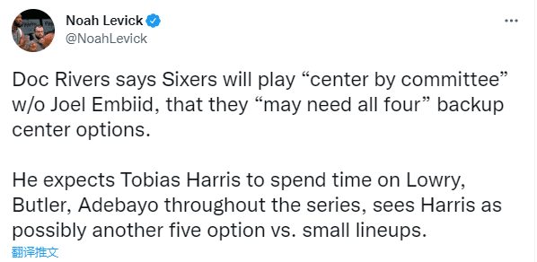 里弗斯还表示:(如恩比德缺战)我们会以哈登为核心,在场上创造更多空间,我们需要打出更多以哈登为主导的进攻,他完全有能力得更多分。