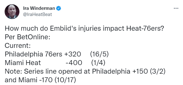 恩比德受伤对次轮的影响很大,热火记者Ira Winderman晒出了恩比德受伤前后,次轮系列赛的赔率变化——76人晋级赔率从+150跌至+320,晋级赔率大幅度下跌;最新夺冠赔率,勇士排名第一,太阳第二和凯尔特人第三,76人垫底。