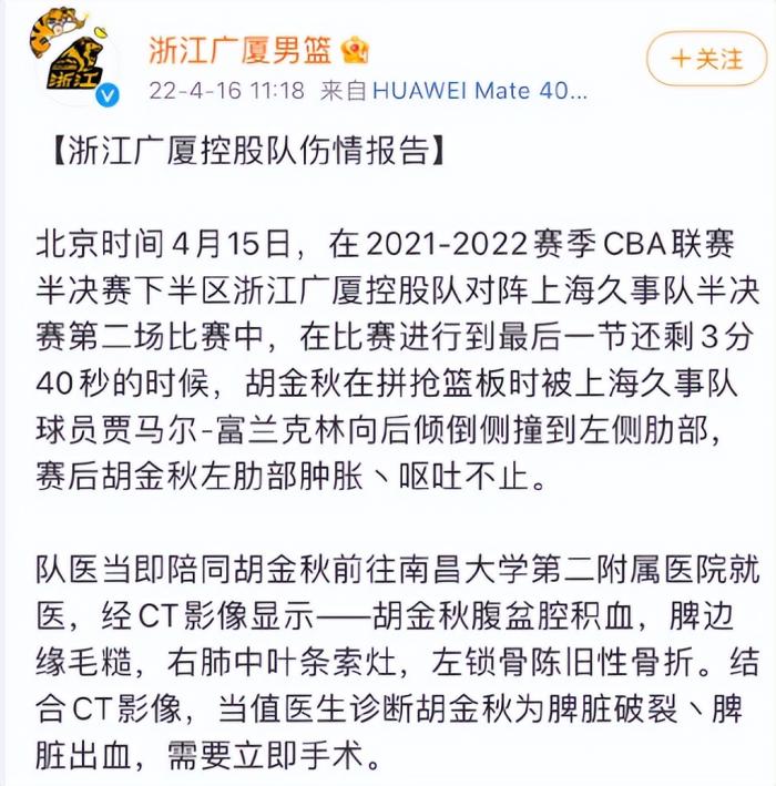 触目惊心!胡金秋脾脏破裂出血+锁骨骨折,赛季报销恐重创广厦