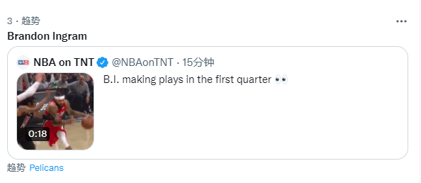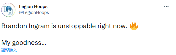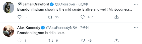英格拉姆首节疯狂表现引热议,瞬间冲上推特热搜榜第3位;前NBA超级第六人贾马尔-克劳福德发推写道:英格拉姆尽情展示中投,我的天呐!