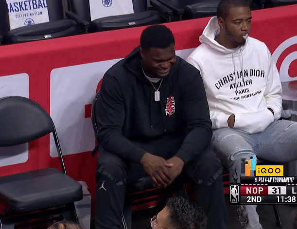 英格拉姆带队冲击季后赛,状元锡安继续缺席比赛,坐在场边观战,嚼着口香糖并且戴着大金链子,镜头给他胖虎时,他忍不住咧嘴大笑,心情十分轻松。