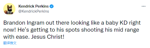 名嘴帕金斯发推写道:布兰登-英格拉姆现在看起来像个小杜兰特!他可以轻松地在中距离投篮。天呐!